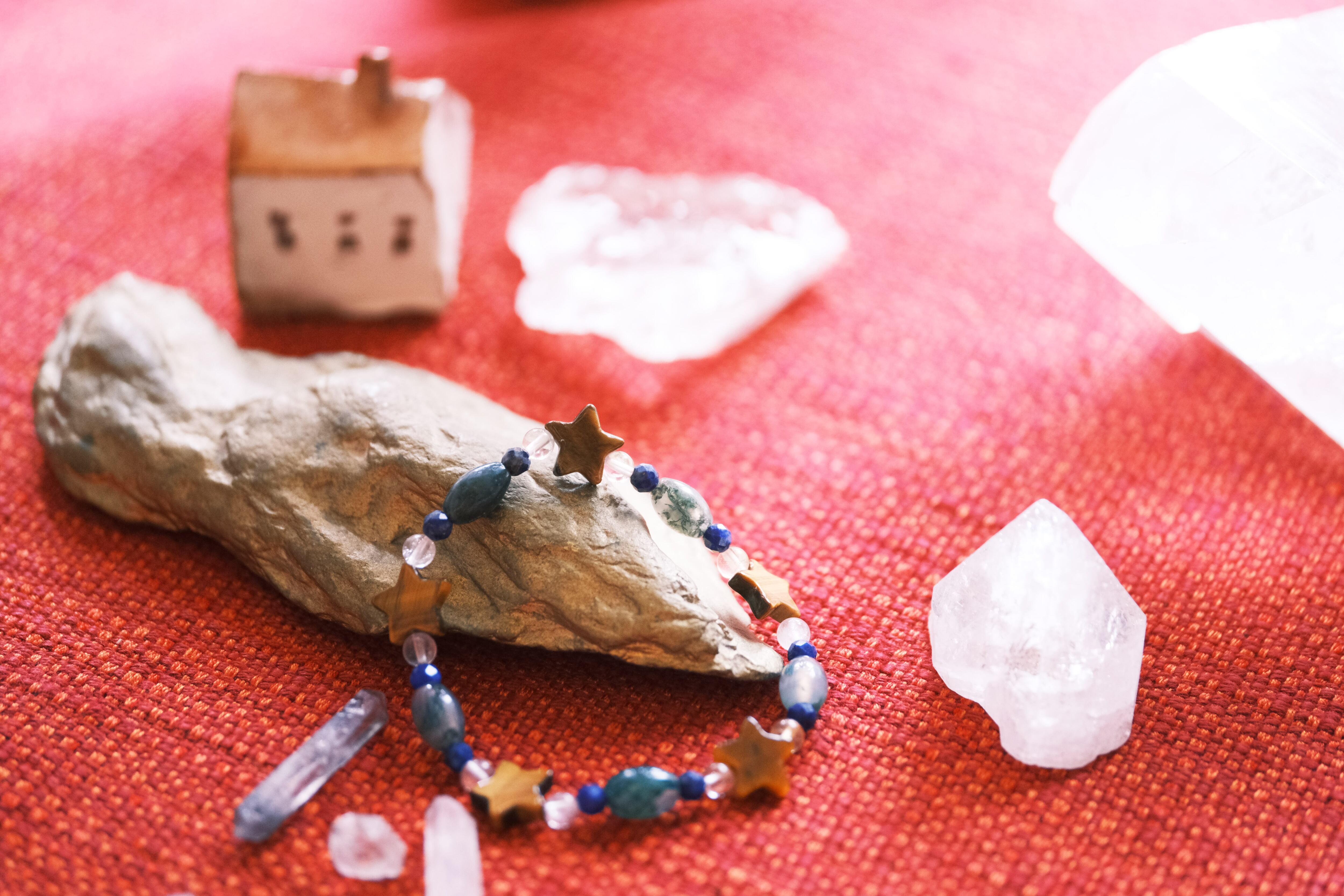 シトリンも非加熱のものを使用(星モチーフを除く)し、天然由来の淡いシャンパンゴールドが他のビーズを彩ります。